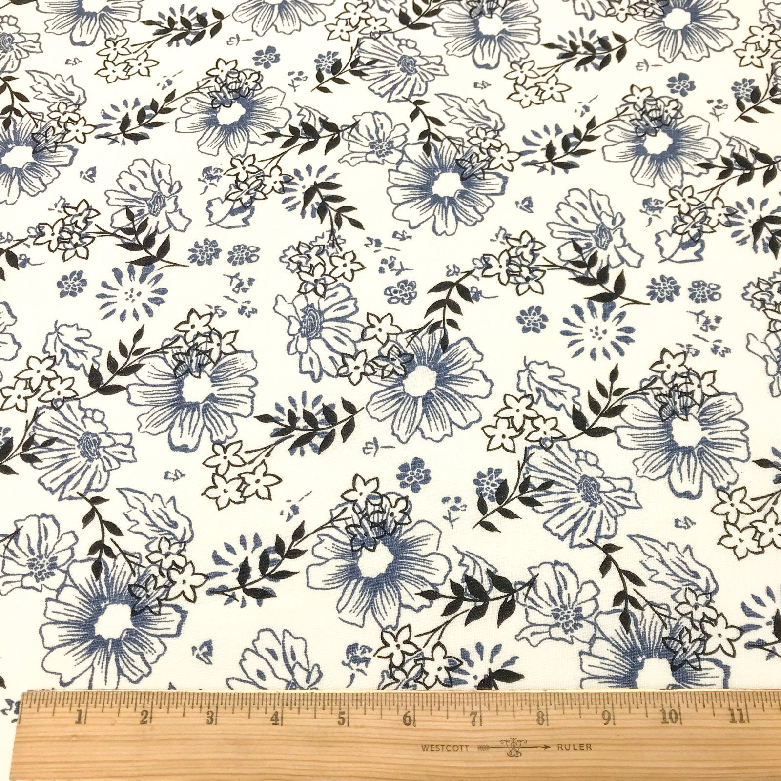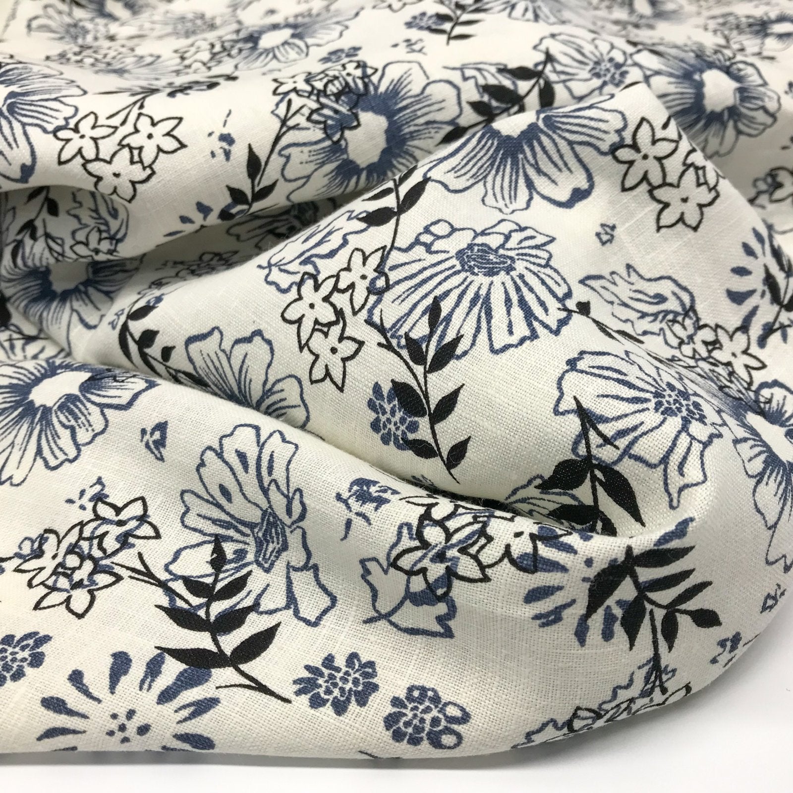 "Cream linen fabric with blue and black floral print – lightweight, breathable, 100% linen for dresses, tops, and tunics."