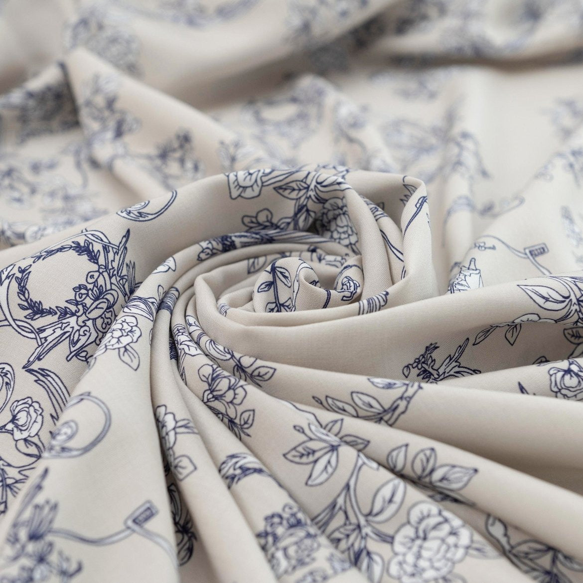 The Rayon Poplin – "Indigo Sketch Floral" is a lightweight, eco-certified fabric that offers softness, drape, and subtle crispness. With its neutral base and delicate indigo floral sketches, it’s perfect for dresses, blouses, tops, and flowing garments. A must-have for sewists looking to create versatile, elegant, and breathable clothing pieces.