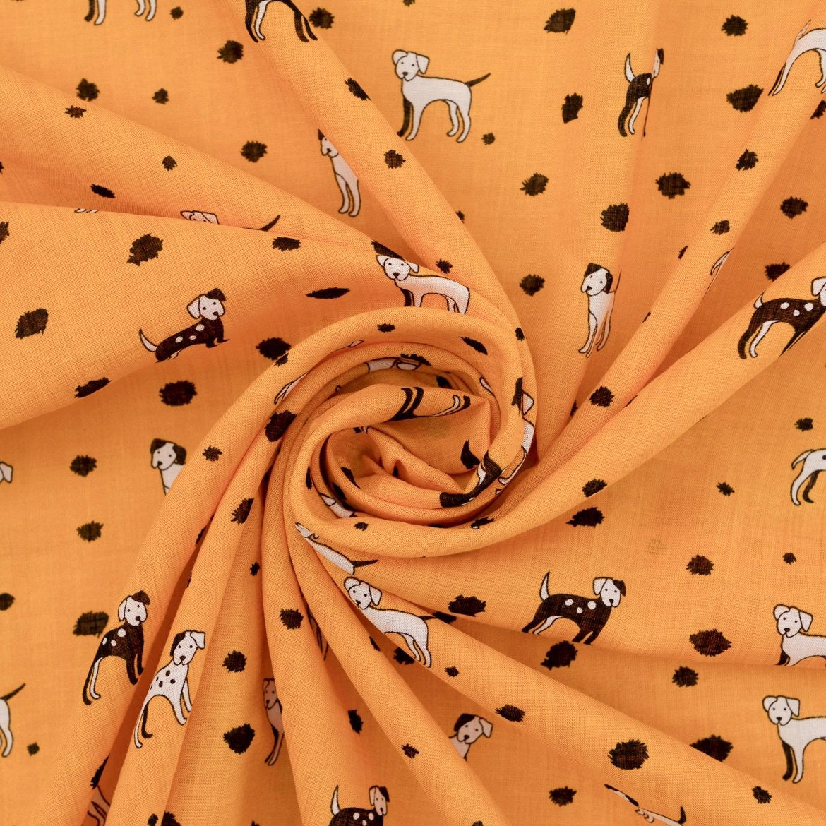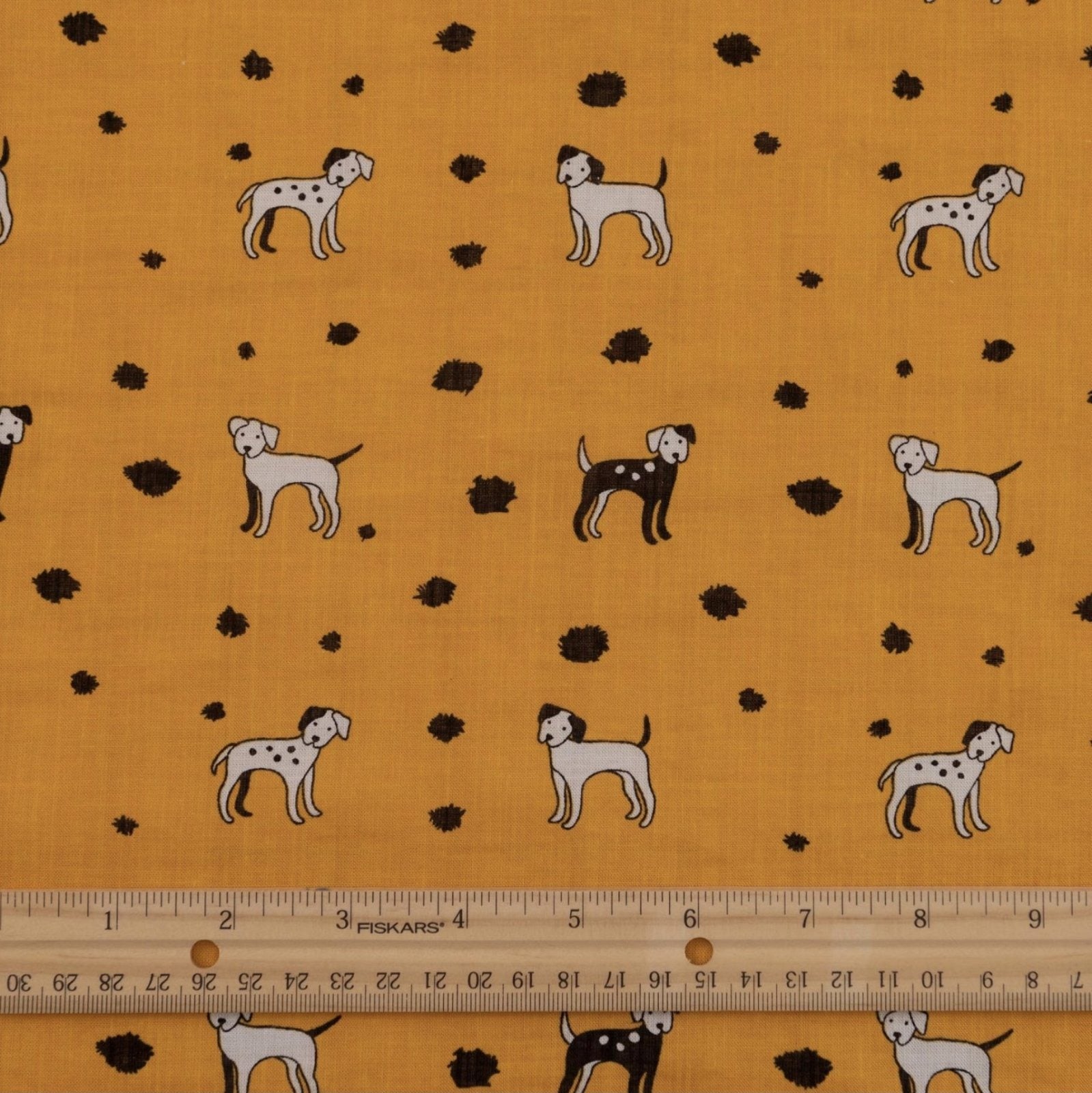 Rayon Cotton Voile fabric with playful black and white puppy print on sunshine yellow background, 50% rayon 50% cotton, 140cm width