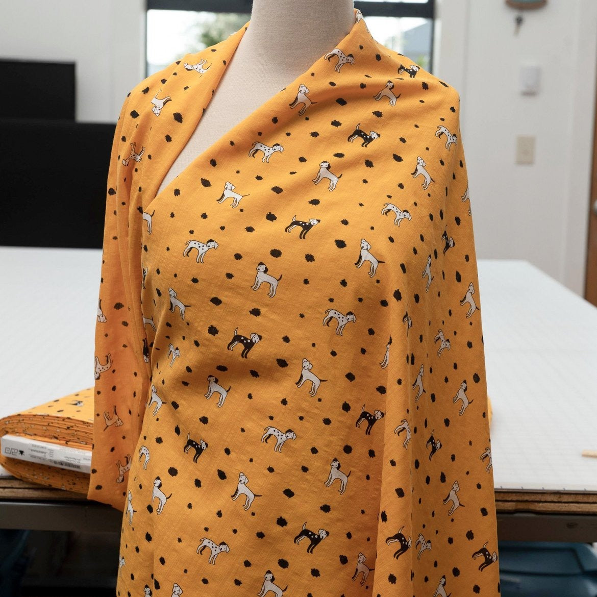 Bring a touch of playful charm to your sewing projects with our Rayon Cotton Voile - "Spot the Dog". This light and flowy fabric features a whimsical black and white puppy print on a vibrant sunshine base, perfect for creating statement garments that are both fun and elegant. Crafted from a 50% Rayon and 50% Cotton blend, this voile fabric has a slight rippled texture and a weight of 2.36oz, making it ideal for robes, flowy dresses, caftans, and even coordinated sets like the Matchy Match Ruffle Brunch Set. The color saturation is vivid, ensuring your creations will pop.