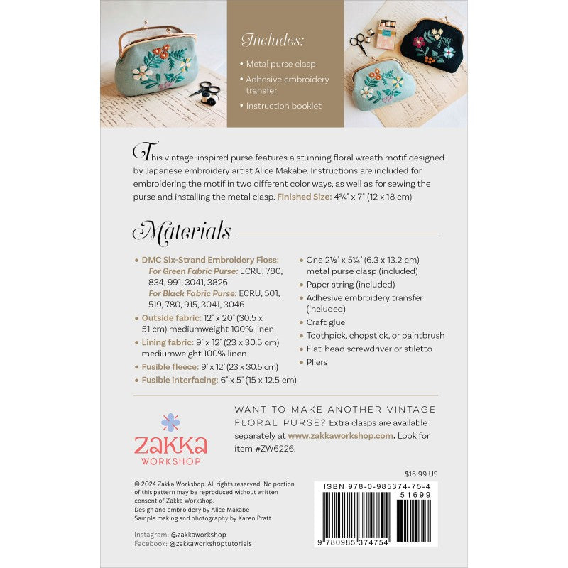 Create a timeless handmade accessory with the Vintage Floral Purse Kit, featuring a beautifully detailed floral wreath motif designed by Japanese embroidery artist Alice Makabe. This charming purse blends classic style with modern craftsmanship and includes everything you need to complete the project: a metal purse clasp, an adhesive embroidery transfer, and a clear instruction booklet. The kit provides step-by-step guidance for stitching the motif in two different colorways, along with instructions for sewing the purse and installing the clasp. With a finished size of 4¾" x 7", this project is perfect for embroidery enthusiasts, gift makers, and anyone who enjoys creating elegant handmade accessories.